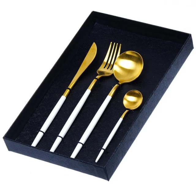 Elevate dining experiences with our 4PCS stainless steel dinner set featuring elegant white handles and gold accents. Packaged in a sophisticated black gift box, this set is ideal for wholesale kitchenware distributors seeking high-end kitchenware sets for retail or hospitality.