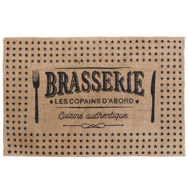 Authentic BRASSERIE Themed Design This rectangular placemat features a distinctive BRASSERIE aesthetic, complete with the phrases "BRASSERIE" and "LES COPAINS D'ABORD" alongside classic utensil graphics. The design evokes the warmth and authenticity of a traditional French kitchen, making it a standout addition to any table setting. It is a perfect accessory for those looking to source thematic ceramic kitchenware and tabletop items.